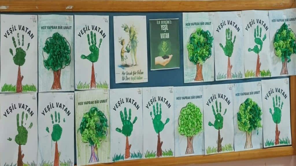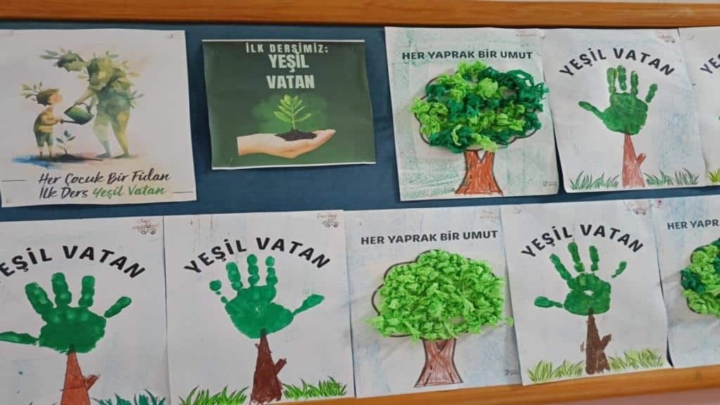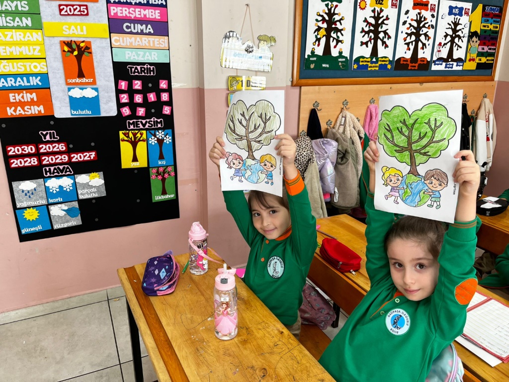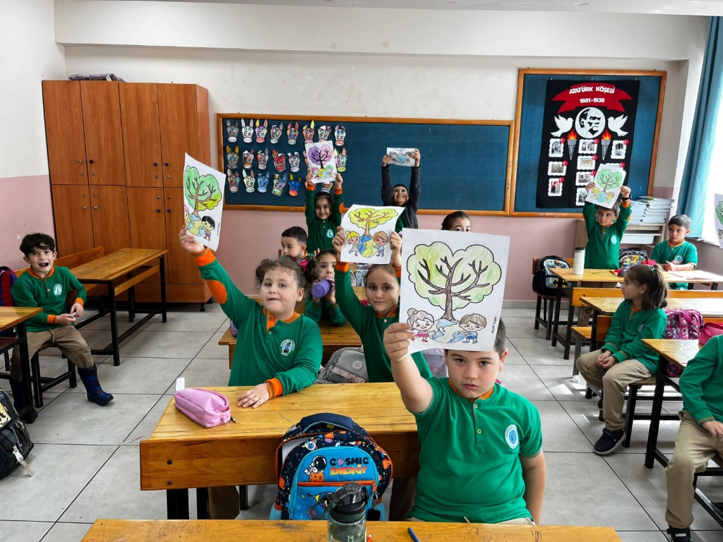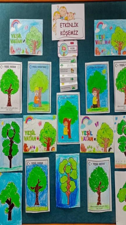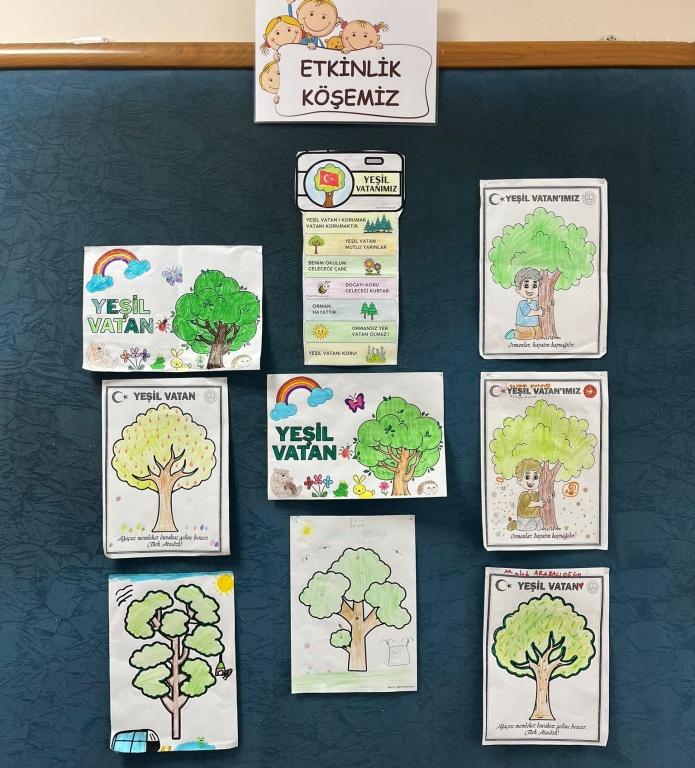 Okulumuz öğrencileri "YEŞİL VATAN Benim Okulum Geleceğe ÇARE" Projesi Eylül ayı etkinliklerini "Tohum,Toprak ve Temiz Hava" teması kapsamında . sınıflarında izledikleri "YEŞİL VATAN " konulu videolardan öğrendiklerini, Görsel Sanatlar derslerinde yaptıkları boyama ve afiş çalışmaları , Müzik dersinde hep birlikte söyledikleri ve öğrendikleri " Tohumlar Fidana" isimli şarkı ile pekiştirdiler. Öğrencilerimiz ayrıca ; Türkçe dersine uyumlu olarak doğada kitap okuma etkinliği yaparak "Tohumun Öyküsü " konusunu işlediler. Öğrencilerimiz yaptıkları çalışmaları okul ve sınıf panolarında sergilerken ; geri dönüştürülebilir , doğa dostu malzemelerle okul koridoruna hazırladıkları " Ağaç Hayattır" ve "Yeşil Dünya maketleri büyük ilgi gördü.